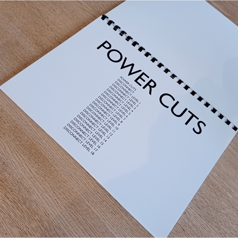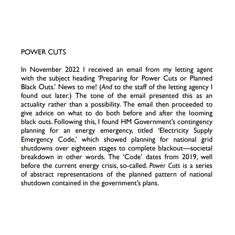 In November 2022 Melville received an email from his letting agent with the subject heading ‘Preparing for Power Cuts or Planned Black Outs.’ The tone of the email presented this as an actuality rather than a possibility, and then outlined advice on what to do both before and after the looming black outs. Power Cuts is a series of abstract representations of the planned pattern of national shutdown contained in HM Government’s contingency planning for an energy emergency, titled ‘Electricity Supply Emergency Code.’